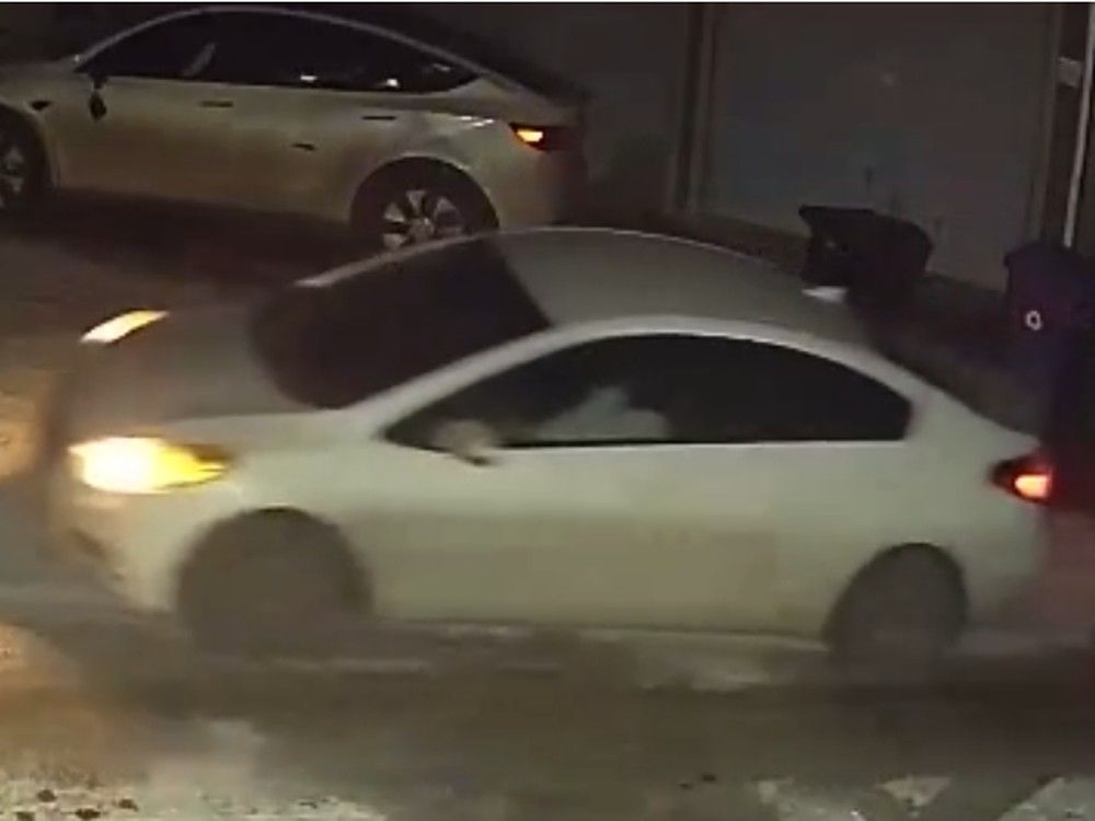 Police have shared a CCTV image of a white, four-door Kia Forte with distinctive black hubcaps that was being driven by two people alleged to have lit the Tesla on fire. The year of the suspect vehicle is between 2014 and 2018.